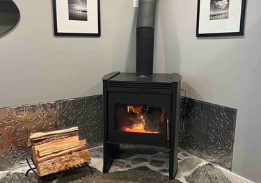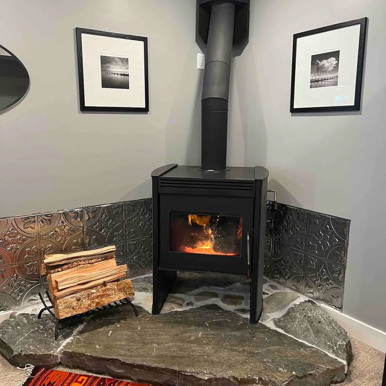 The cozy fireplace will keep you warm during the winter months. This is a high efficiency wood stove that is not only functional but creates a perfect spot to relax.